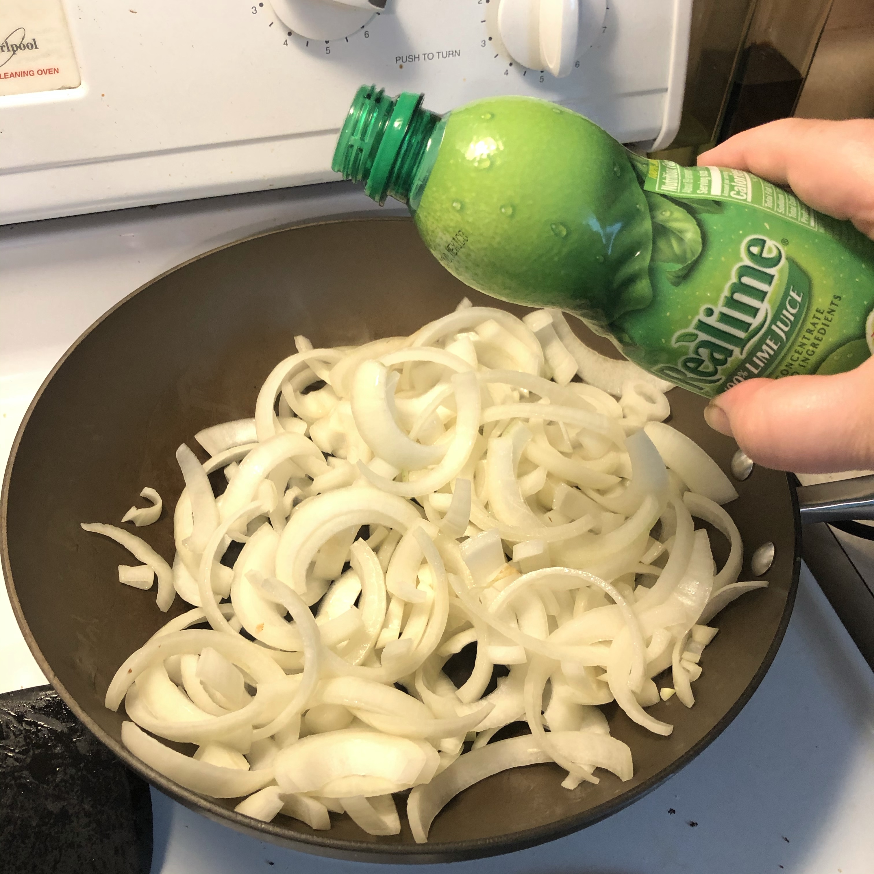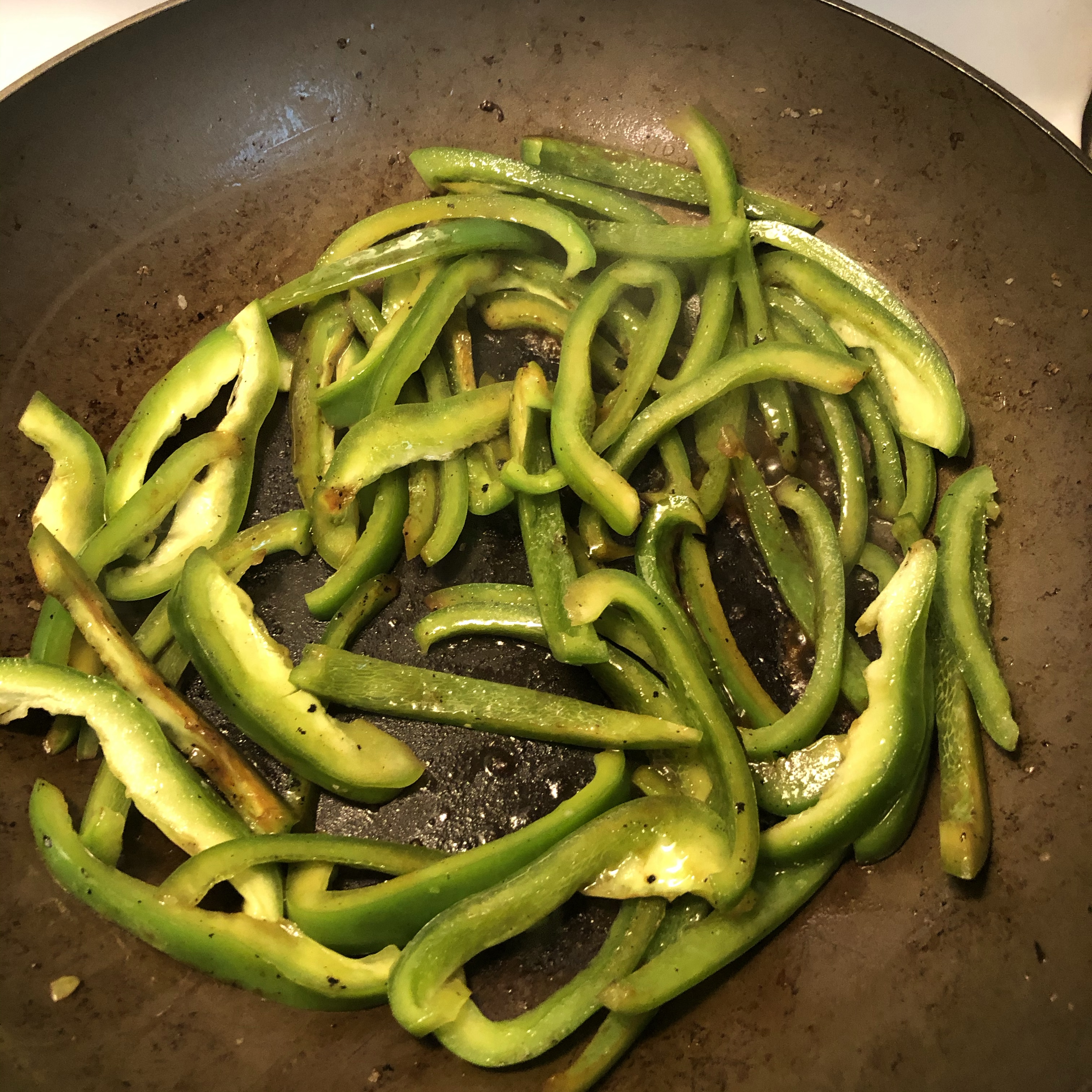 ◦ Add green peppers. Stir to coat all in oil. Now the hard part. RESIST THE URGE TO CONSTANTLY STIR THESE. Let them get a little char first. Then stir. If you don’t want them to dry out, add a splash of water (or lime juice) to the middle when you stir. Once done, add them to your meal containers.