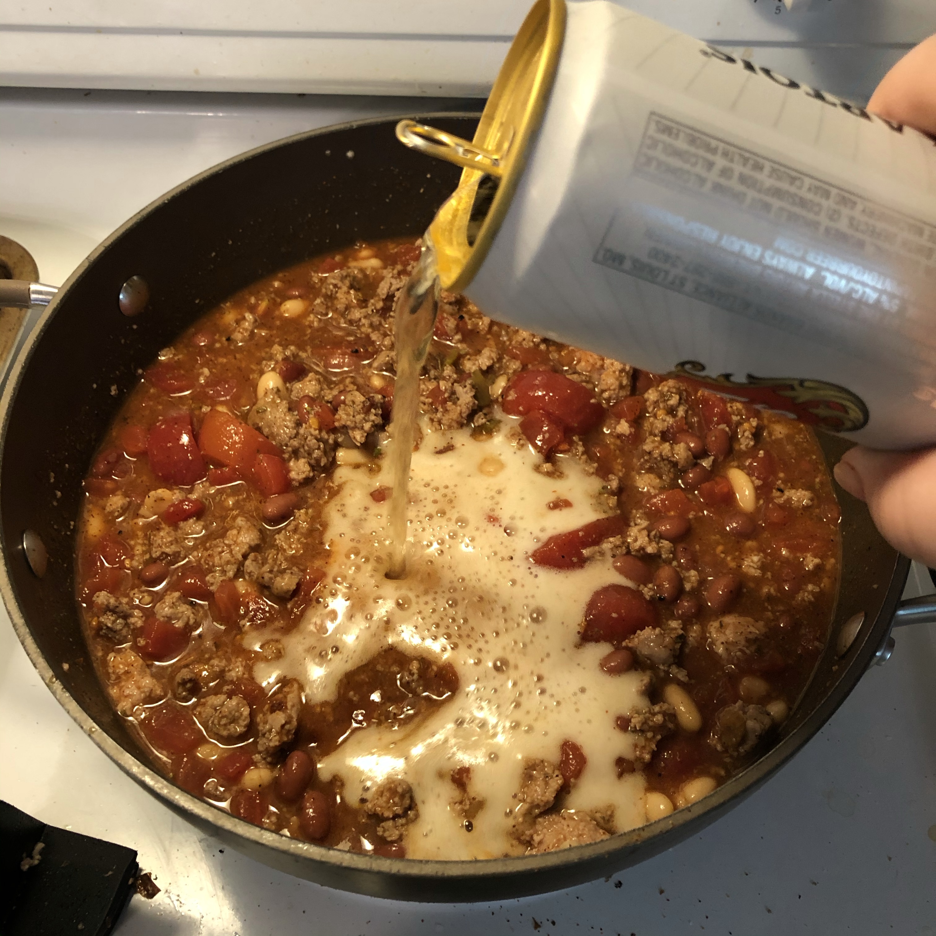 ◦ Add cans of tomatoes and chili beans to pot